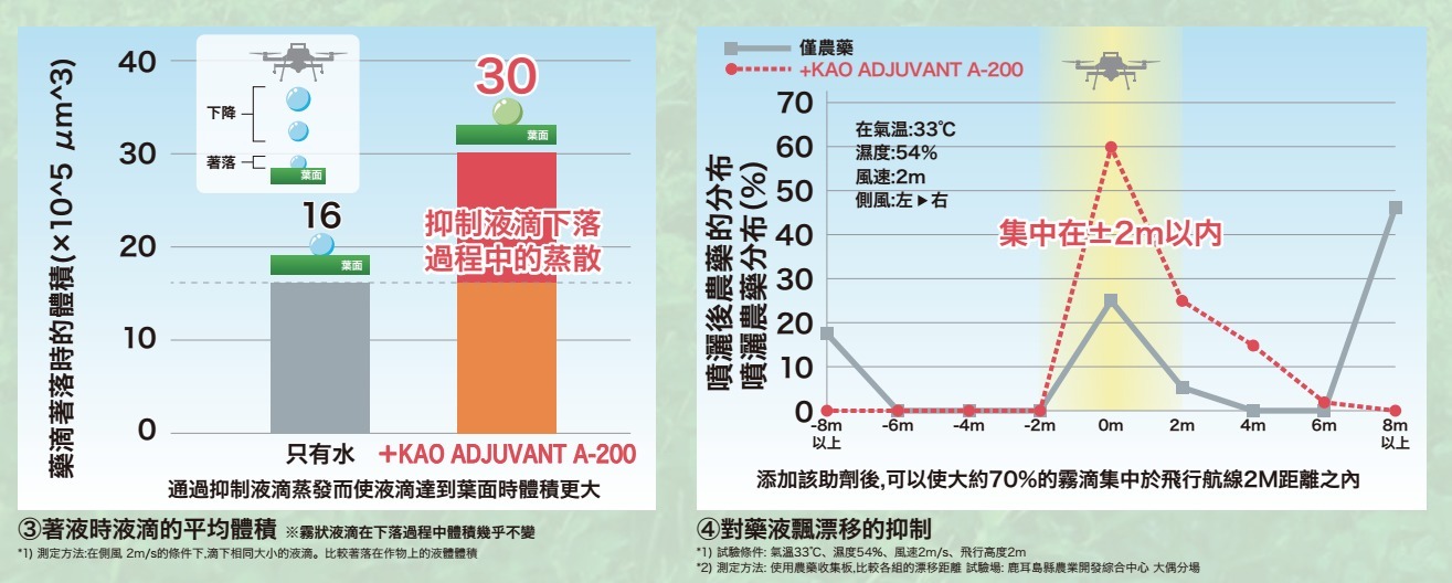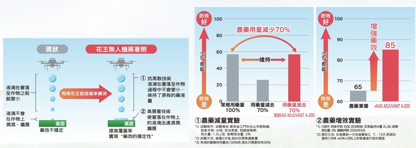 本次上市的“KAO ADJUVANT A-200”運用了花王獨有的“蒸發抑制技術”和“展延提升技術”,旨在解決使用無人機進行農藥施藥時所面臨的問題!