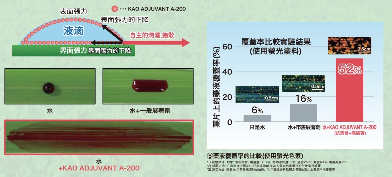 傳統的技術是透過降低藥液的表面張力來提高其在作物上的附著性,而花王則是著重在作物表面與藥液之間的“界面張力”,透過界面活性劑,使表面張力和界面張力兩者同時下降,這樣能大幅提高藥液與作物表面的融合性。