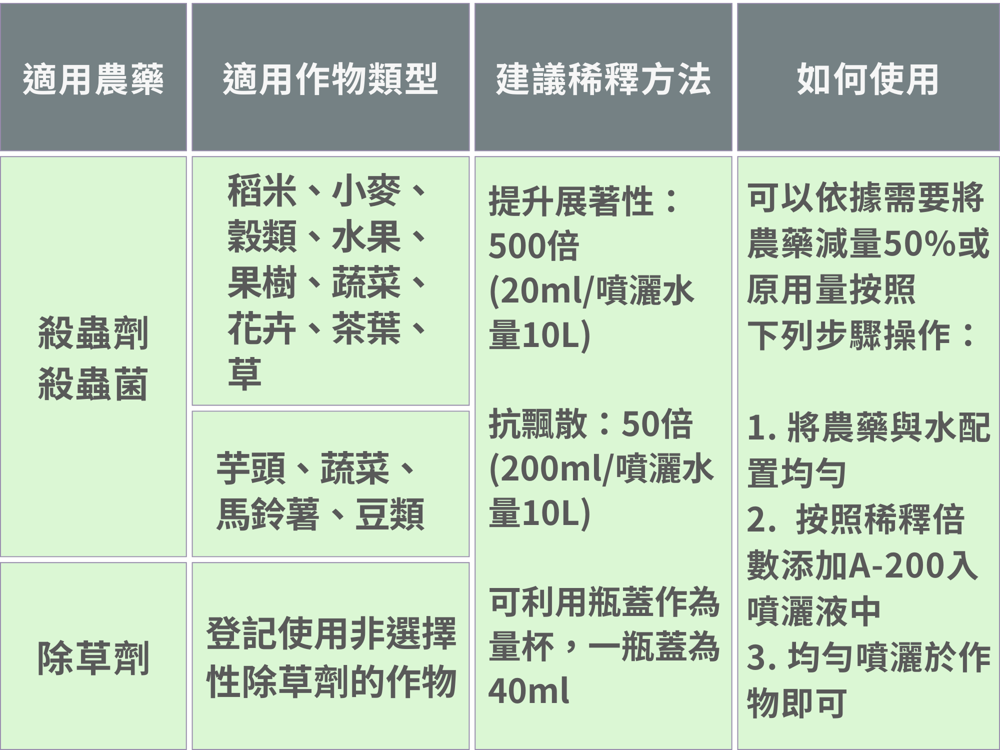 作為植保無人機/一般噴灑用鋪展滲透增效劑使用與殺蟲劑、殺蟎劑、殺菌劑、除草劑及生物農藥 即配即用,配置後的藥劑應於4小時內完成噴灑。