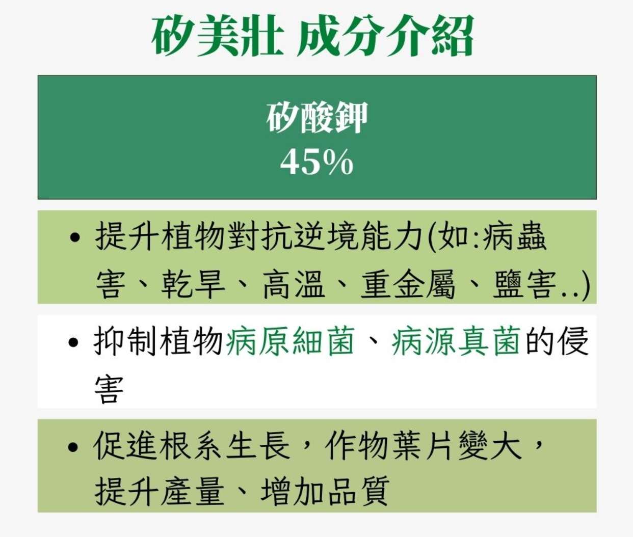 ※避免與鈣、銅等二價金屬資材混用,若有混用需求,可於加水稀釋最後一步再添加矽美壯,減少沉澱產生的機會。