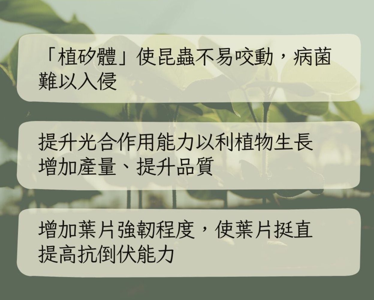 ☉緩和重金屬的毒害 : 鐵、鋅、鋁、錳、砷、鉻 ,緩和硼缺失症狀